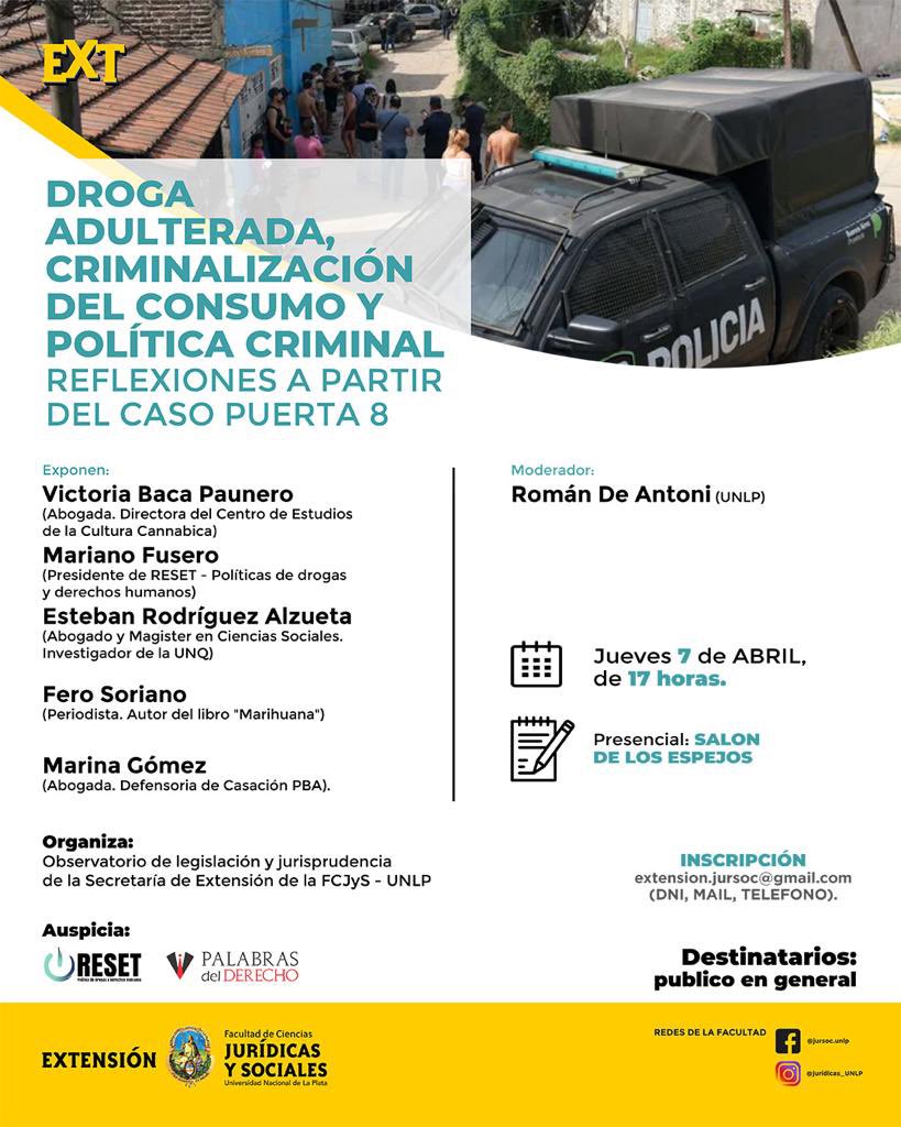 Desde el Observatorio de Legislación y Jurisprudencia de la Secretaría de Extensión (FCJyS-UNLP) invitamos a participar de la próxima jornada sobre “Droga adulterada, criminalización del consumo y política criminal. Reflexiones a partir del caso Puerta 8”, que se lleva a cabo de manera presencial el jueves 7 de abril a las 17hs.